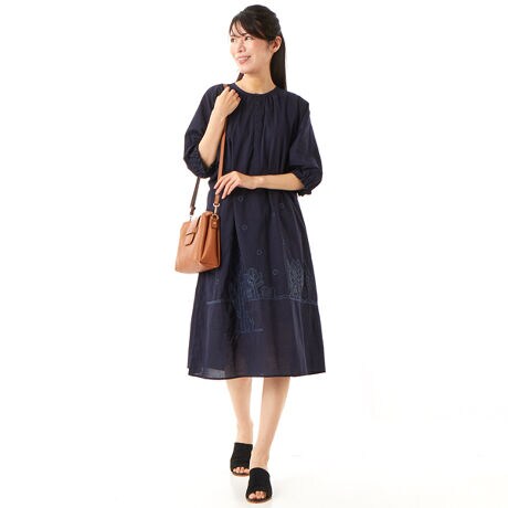 [型番:34120652]スラブ糸を用いたローン生地に、夜空の風景をモチーフにしたアップリケ刺繍を施したワンピース。空には星が瞬き、一匹のネコが家の明かりを見ています。後ろ身頃は縦に切り替えを入れることで、すっきりとしたシルエットに仕上げました。前立ての可愛らしいボタンもポイントです。丈が長いアイテムにあると嬉しいポケット付き。お手入れ:手洗い店舗へお問い合わせの際は、下記の品番をお申し付け下さい。[品番:34120652]