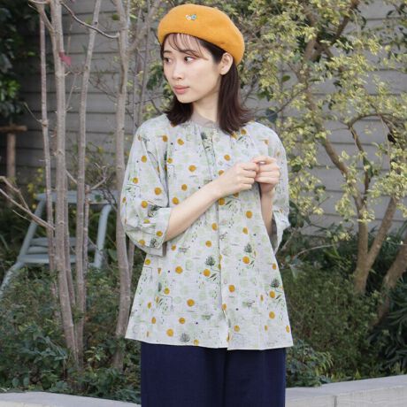 SUPER HAKKA定番のコットンシャーリング素材に、オバタクミさんの作品をプリントしたブラウス。