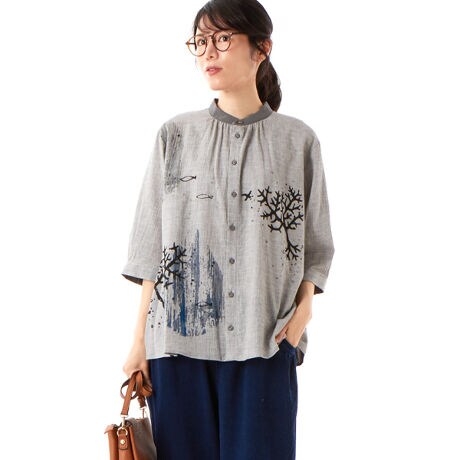 SUPER HAKKA定番のコットンシャーリング素材に、オバタクミさんの作品をプリントしたブラウス。