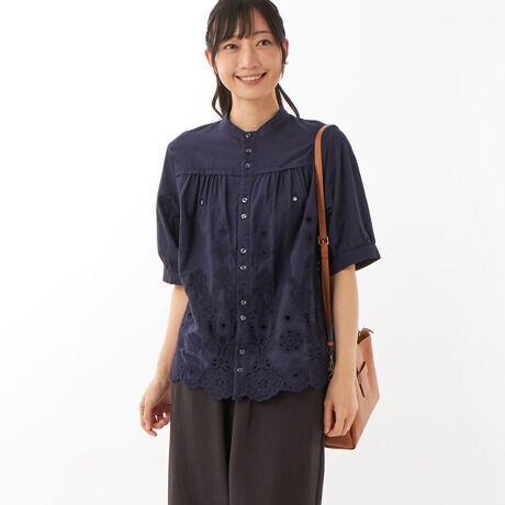 裾にフラワースカラップのケミカルレースを施したブラウス。