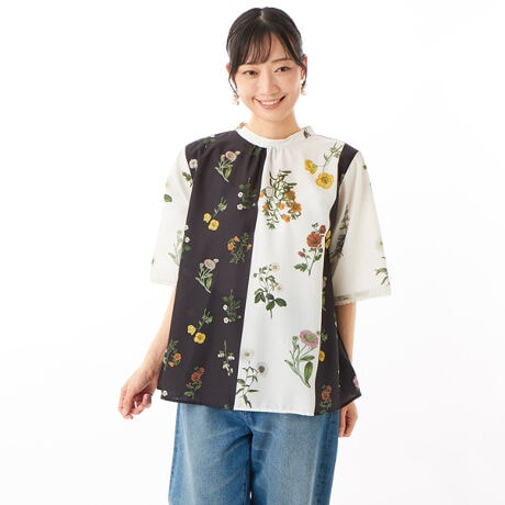 ポリエステルワッシャーボタニカルフィールドガイドパネルプリントスタンドカラーブラウス