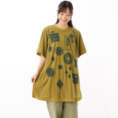 レーヨンコットンローン×チュール レースフレーム刺繍チュニックブラウス