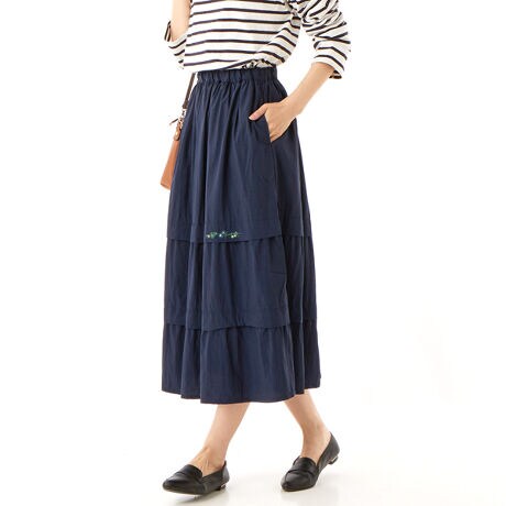 [型番:34170052]軽やかな素材感のブロード生地を使用したスカート。2段のタックがティアード見えするデザイン性のある1着です。1段目のタックには、繊細な線画に、配色のカラーが可愛いフラワー刺繍をワンポイントで施しました。ウエストはゴム&紐で快適な履き心地です。あると嬉しい便利な両サイドポケット付き。お手入れ:手洗い店舗へお問い合わせの際は、下記の品番をお申し付け下さい。[品番:34170052]