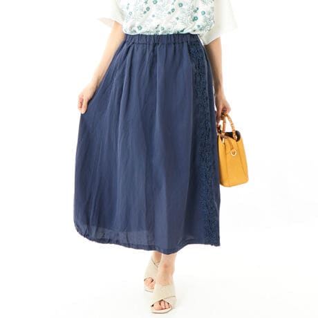 [型番:34170152]柔らかく光沢感のある麻混の素材のバルーンスカート。トレンドのバルーンシルエットをベースに、裾は部分的にギャザーを寄せたデザインに。前面にあしらったフラワーモチーフのレーステープが可愛らしい1着です。ウエストはゴム&紐で快適な履き心地です。お手入れ:手洗い店舗へお問い合わせの際は、下記の品番をお申し付け下さい。[品番:34170152]