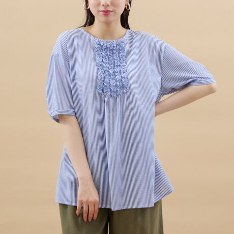 このストライプ柄フリルブラウスは、夏のコーディネートにぴったりな一着です。