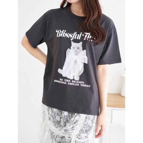 ・ネコプリントにチュールリボンが施されたTシャツ。