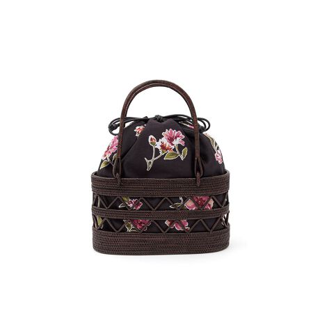 落ち着いた色彩の籠に、花々やストライプの幾何学模様のプリントが華やかな巾着のかごバッグです。