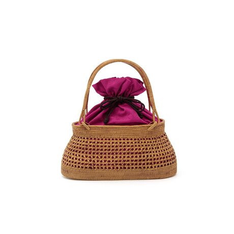 落ち着いた色彩の籠に、シンプルな巾着と煌めく刺繍がかわいい巾着のかごバッグです。