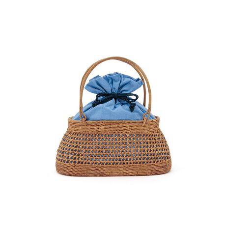 落ち着いた色彩の籠に、シンプルな巾着と煌めく刺繍がかわいい巾着のかごバッグです。