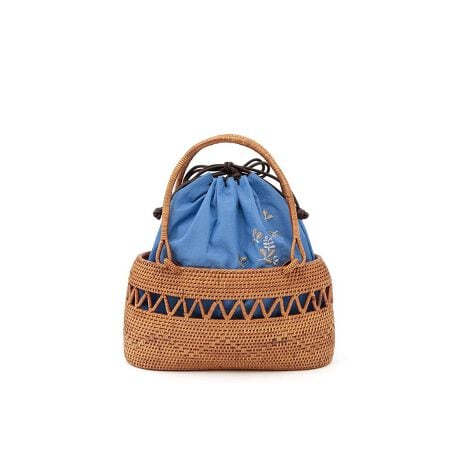 落ち着いた色彩の籠に、シンプルな巾着と煌めく刺繍がかわいい巾着のかごバッグです。