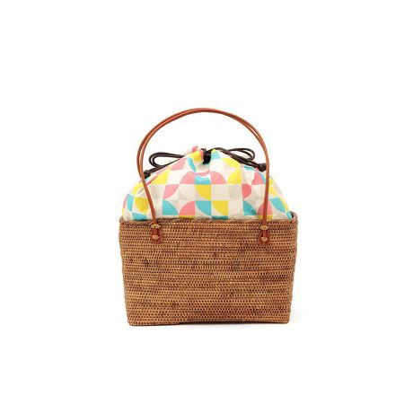 落ち着いた色彩の籠に、幾何学模様のカラフルなプリントが華やかな巾着のかごバッグです。