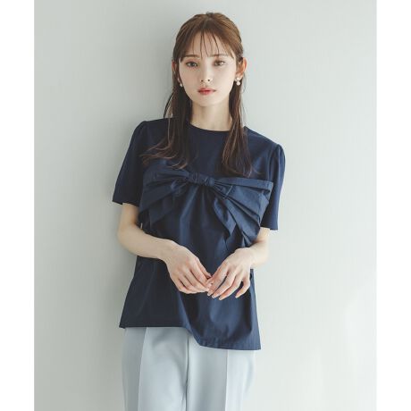 胸のリボン部分から下がブラウスのような、素材を切り替えたドッキングデザイン。単調になりがちなTシャツスタイルにフェミニンな可愛さをアクセントに加えました。ポイントとなるキャッチーで大きなリボン。シンプルなボトムスに合わせたい、1枚でオシャレに見える主役級トップスです。オフ×ブラックとネイビーのシックな2色展開で、大人の女性におすすめなアイテムです。