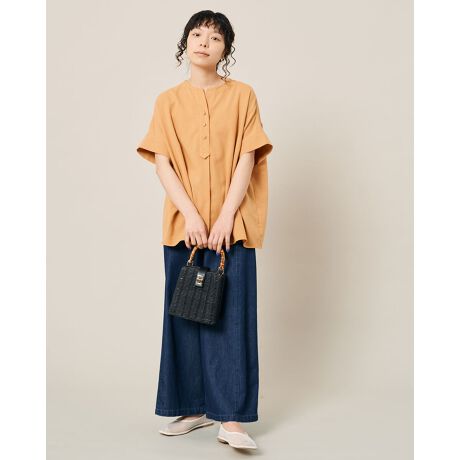 肩から落ちる袖付きで腕周りをカバーしています。くるみ釦もアクセントになっています。