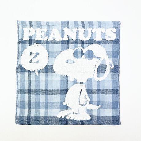 ふんわり柔らかい肌ざわりのウォッシュタオルです。シックなブルーカラーのチェックのガーゼ地に、スヌーピーを無撚糸パイルで表現♪