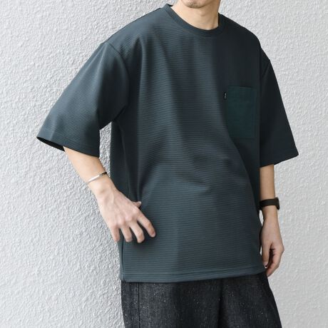 胸元にナイロン素材のポケットを採用し、サイドにはピスネームを施したTシャツ。