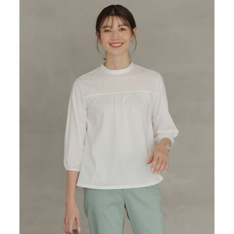 胸元にストライプ柄のカラミ組織を使用し、レースのような見え感に仕上げたブラウスライクなカットソー。さらにギャザーを入れることで、ふんわりとAラインシルエットにしています。パンツはもちろん、細身のスカートと相性も抜群です。