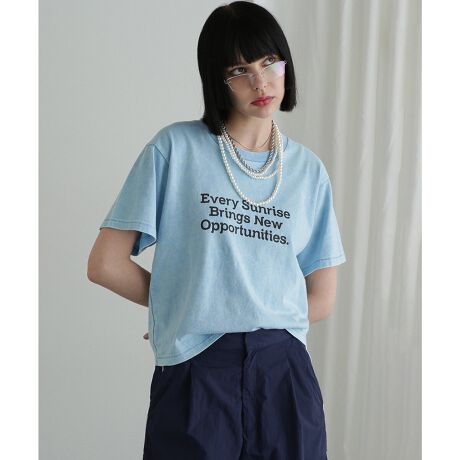 カラーが目を惹くロゴTシャツはトレンドのコンパクトサイズ。