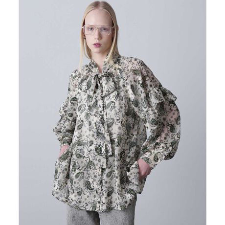 ペイズリー柄のプリントが入ったカットジャカード生地のボウタイブラウス。
