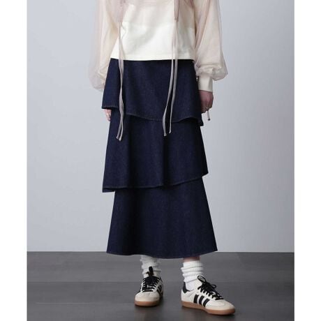 カジュアルと女性らしい2つの印象がミックスされたデニム素材のティアードスカート。