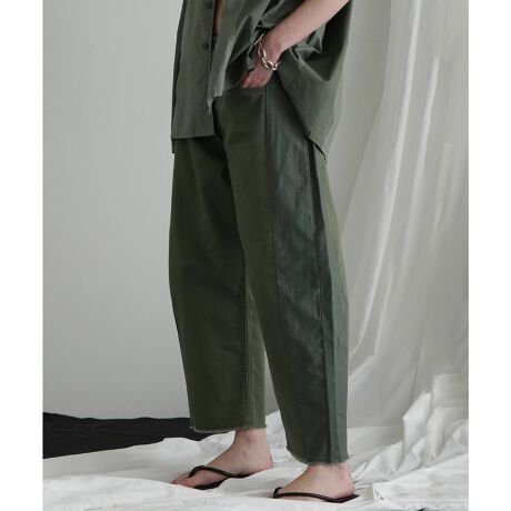 素材や色の異なる2つの素材を組み合わせたリメイク風のバレルシルエットパンツ