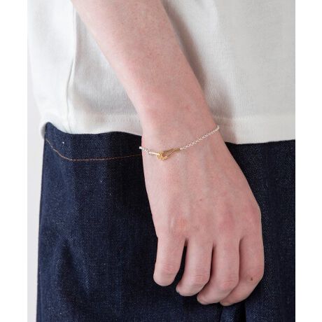 [型番:011910000013]フックの部分に草花を巻きつけたようなデザインが特徴的なブレスレットです。細めの華奢なチェーンに10金でコーティングされたパーツがアクセントとなっています。 日本製商品となります。