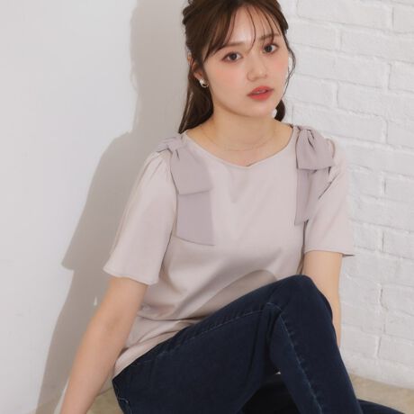 リボンディティールで肩回りが華奢見えし、大人可愛いTシャツです