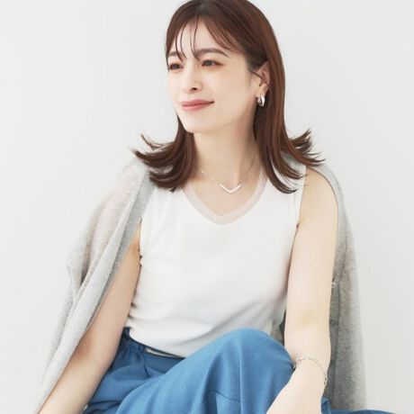 スキッパーブラウスやシャツ、カーディガンなどのインナーに合わせていただくのがおすすめですし、透け感のあるトップスとも合わせられます。