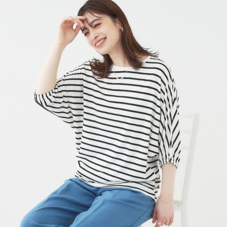 ドルマンスリーブでゆったりシルエットなのですっきり見えするテーパードパンツなど合わせるのがオススメです。