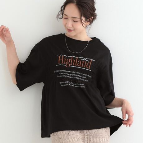 胸にロゴプリントを施し、さらにシャーリングステッチを入れたデザインTシャツ。