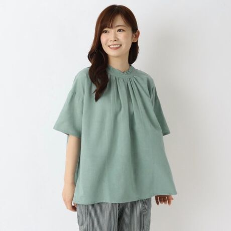 落ち感があり、涼感もあるので春夏にぴったりな半袖フリルブラウス。