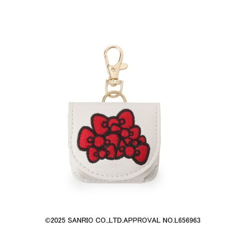 ハローキティのお顔とトレードマークのリボンを合成皮革に刺繍で表現したチャームポーチ。