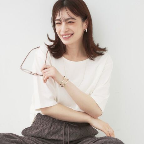 着回しやすく、二の腕周りもカバーしてくれる5分袖トップス。