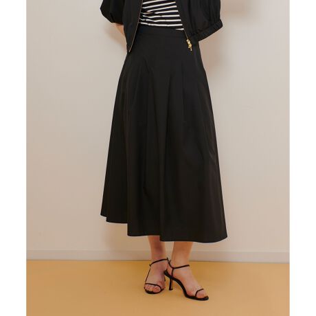 スカートは段違い(アンイーブン)にタックを抑え、腰回りはフィットさせて、裾に向かって拡がるシルエット。