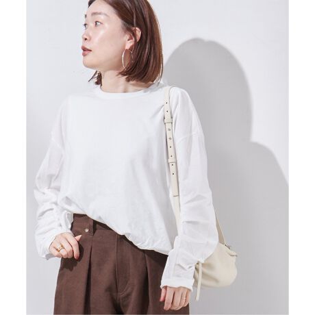 シンプルなデザインながら、袖のギャザーが目を引くカットソー。