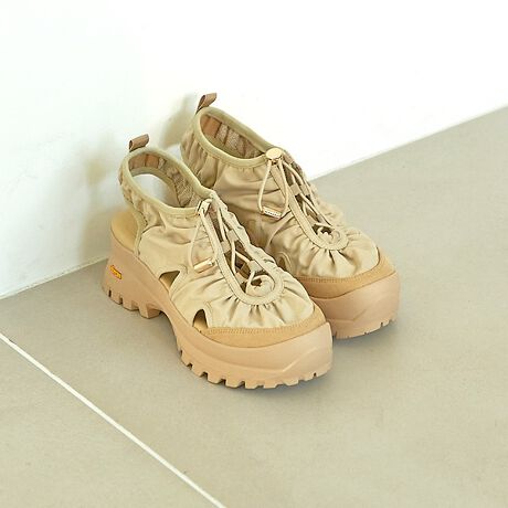 クシュッとシャーリングがかかった女性的なアッパーデザインとボリューミーな厚底ソールの対比が、Au BANNISTERらしい大人っぽさと高級感のある雰囲気に。