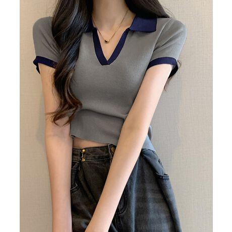 Vネックラインが顔回りをすっきりと見せ、女性らしい印象漂う半袖サマーニット
