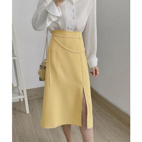 シンプルデザインに三連パールチェーンを加えた華やかなAラインバックファスナータイトスカート