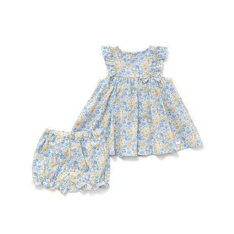 リバティのアーカイブから発見された手描きのアートワークを ベースにした「フローレンス・メイ」を使用したベビー用ブルマ付きワンピース。
