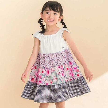 花柄やチェック柄の切り替えがティアードになった女の子用ワンピース。