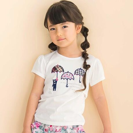 クマさんが持った傘に花柄やチェック柄がワンポイントになった女の子用半袖Tシャツ。