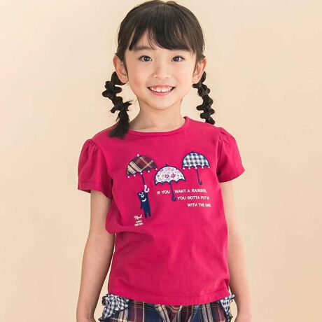 クマさんが持った傘に花柄やチェック柄がワンポイントになった女の子用半袖Tシャツ。