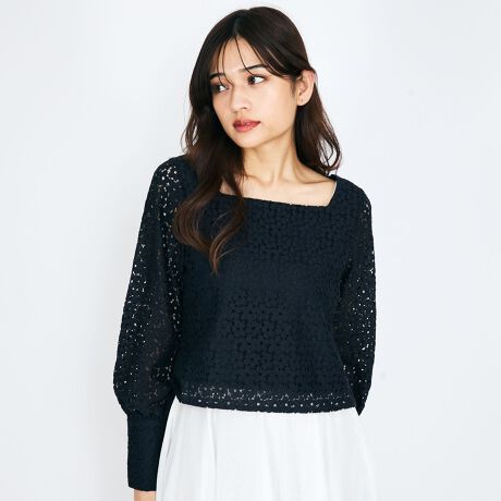 少女と大人が共存するような可憐なフラワーモチーフのレース生地を使用したスクエアネックのブラウスは、ロングカフスデザインがポイント。