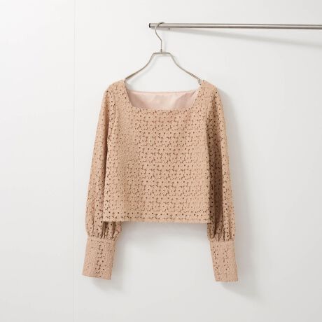 少女と大人が共存するような可憐なフラワーモチーフのレース生地を使用したスクエアネックのブラウスは、ロングカフスデザインがポイント。