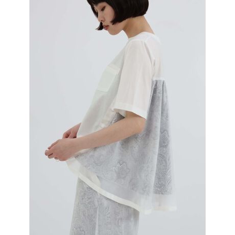 シアー素材から覗くペイズリー柄がアクセントになったデザインTシャツ。