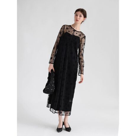 フロッキー加工で施した繊細なフラワーデザインのチュールドレスと、柔らかなベロア素材のキャミソールドレスのセットアイテム。