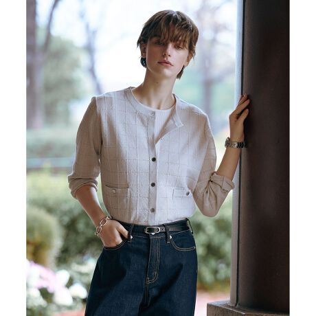 ■デザイン程良い透け感に、格子柄をプラスしJ.PRESSオリジナル金ボタンをあしらったクラシカルなニットジャケット。とても軽やかな着心地で、インナーを袖無しトップスから長袖と変えて頂くことで秋まで活躍します。パンツやスカート共によく合う丈感で、羽織るだけでコーディネートを格上げしてくれます。肌離れの良い素材なので、蒸し暑さが気になる季節にもおすすめです。
