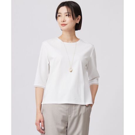 ■デザイン袖口と襟にシアーな別布を用い、シンプルでベーシックなTシャツをワンランク上に演出するカットソー。合わせるアイテムを選ばない、1枚着としてもインナーとしても活躍する春の季節にぴったりな1着。6分袖なので春~秋まで長いシーズン着用いただける、万能アイテムです。すっきりとした見映えで、フレアスカートやワイドパンツとの相性がよく、上品な印象にしてくれます。