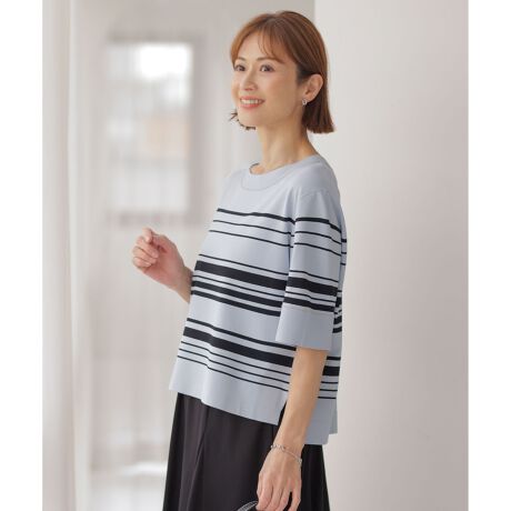 ■デザインTシャツライクに着用できる、ボーダーニットプルオーバー。身幅はややゆとりを持たせ、ボディラインを拾わず優しく身体にフィットするサイズ感にこだわりました。衿と袖口にはガーター編みを入れ、全体のバランスを引き締め、ラメ糸で上品にトレンド感を演出した1着です。身体離れの良いシルエットでさらりと着用ができ、真夏まで活躍します。ボーダー柄がコーディネートのアクセントとなり、シンプルなスカートやパンツに合わせるのもおすすめです。