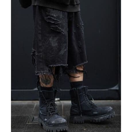 オーバーサイズデニムをベースに部分的にコーティングを施し、ダメージや加工を繰り返す事で、ヴィンテージの様な風合いに仕上げたショーツです。