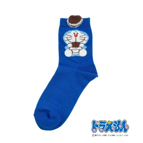 大人気「ドラえもん」の部分ブークレー素材のクルー丈ソックスの登場です。どら焼きを持っているドラえもんがかわいいデザインです。お家でもお外でも、いつでもお気に入りのキャラクターを楽しむことができます。
